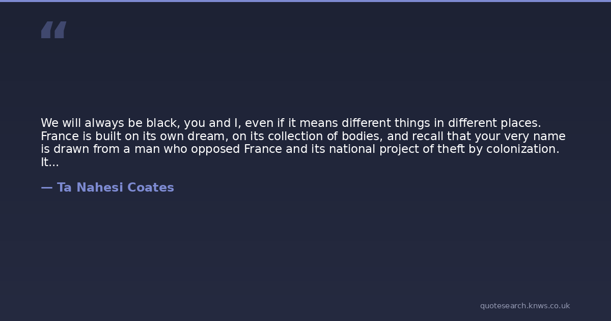We will always be black, you and I, even if it means different things in different places. France is built on its own dream, on its collection of bodies, and recall that your very name is drawn from a man who opposed France and its national project of theft by colonization. It is true that our color was not our distinguishing feature there, so much as the Americanness represented in our poor handle on French. And it is true that there is something particular about how the Americans who think they are white regard ussomething sexual and obscene. We were not enslaved in France. We are not their particular problem, nor their national guilt. We are not their niggers. If there is any comfort in this, it is not the kind that I would encourage you to indulge. Remember your name. Remember that you and I are brothers, are the children of trans-Atlantic rape. Remember the broader consciousness that comes with that. Remember that this consciousness can never ultimately be racial; it must be cosmic. Remember the Roma you saw begging with their children in the street, and the venom with which they were addressed. Remember the Algerian cab driver, speaking openly of his hatred of Paris, then looking at your mother and me and insisting that we were all united under Africa. Remember the rumbling we all felt under the beauty of Paris, as though the city had been built in abeyance of Pompeii. Remember the feeling that the great public gardens, the long lunches, might all be undone by a physics, cousin to our rules and the reckoning of our own country, that we do not fully comprehend.