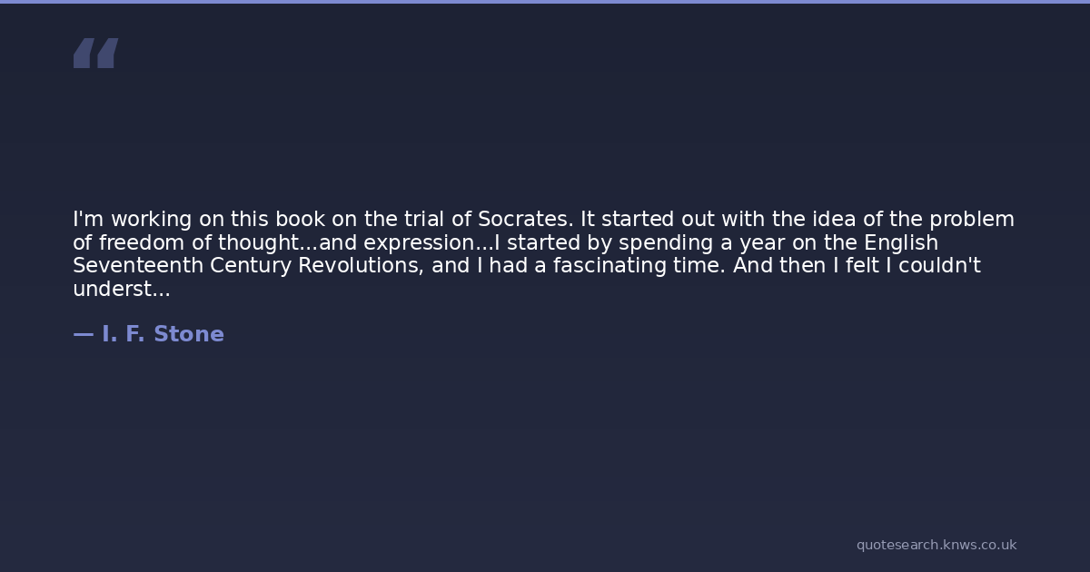 I'm working on this book on the trial of Socrates. It started out with the idea of the problem of freedom of thought...and expression...I started by spending a year on the English Seventeenth Century Revolutions, and I had a fascinating time. And then I felt I couldn't understand the English Seventeenth Century Revolutions without understanding the Reformation. When I got to the Reformation, I felt that I had to understand the premonitory movements that began in the Middle Ages. When I got there, I felt I had to understand the classical period." (quoted in Andrew Patner, I. F. Stone: A Portrait, p. 21)