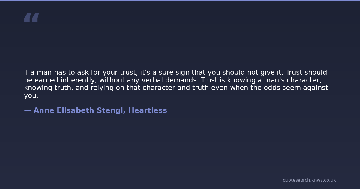 If a man has to ask for your trust, it's a sure sign that you should not give it. Trust should be earned inherently, without any verbal demands. Trust is knowing a man's character, knowing truth, and relying on that character and truth even when the odds seem against you.