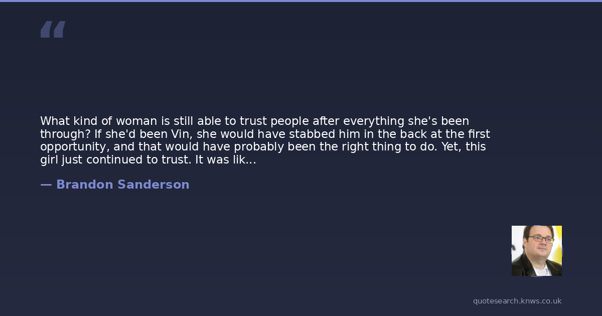 What kind of woman is still able to trust people after everything she's been through? If she'd been Vin, she would have stabbed him in the back at the first opportunity, and that would have probably been the right thing to do. Yet, this girl just continued to trust. It was like finding a beautiful plant growing alone in a field of burnt ash.