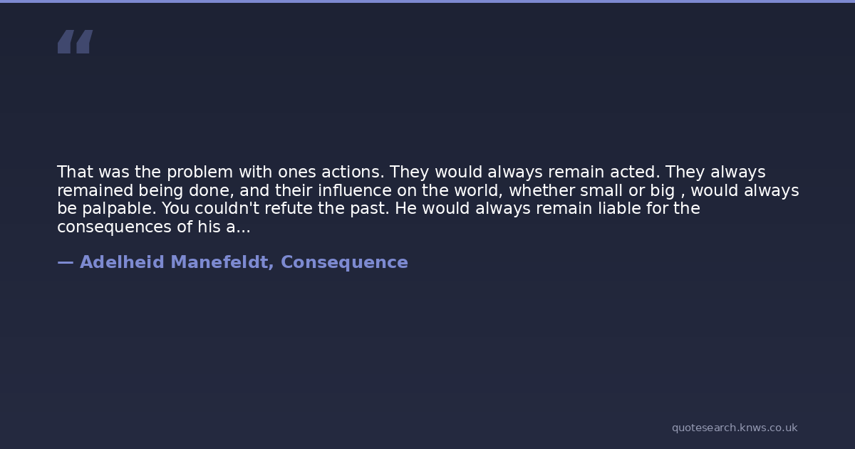 That was the problem with ones actions. They would always remain acted. They always remained being done, and their influence on the world, whether small or big , would always be palpable. You couldn't refute the past. He would always remain liable for the consequences of his actions. Should anyone knock on his door and ask for reparation, he would give what was asked of him without question. There simply was no way of clearing the world of its history, and its history was simply a compilation of the existence of people and other organisms , and their actions. Of things which had been done.