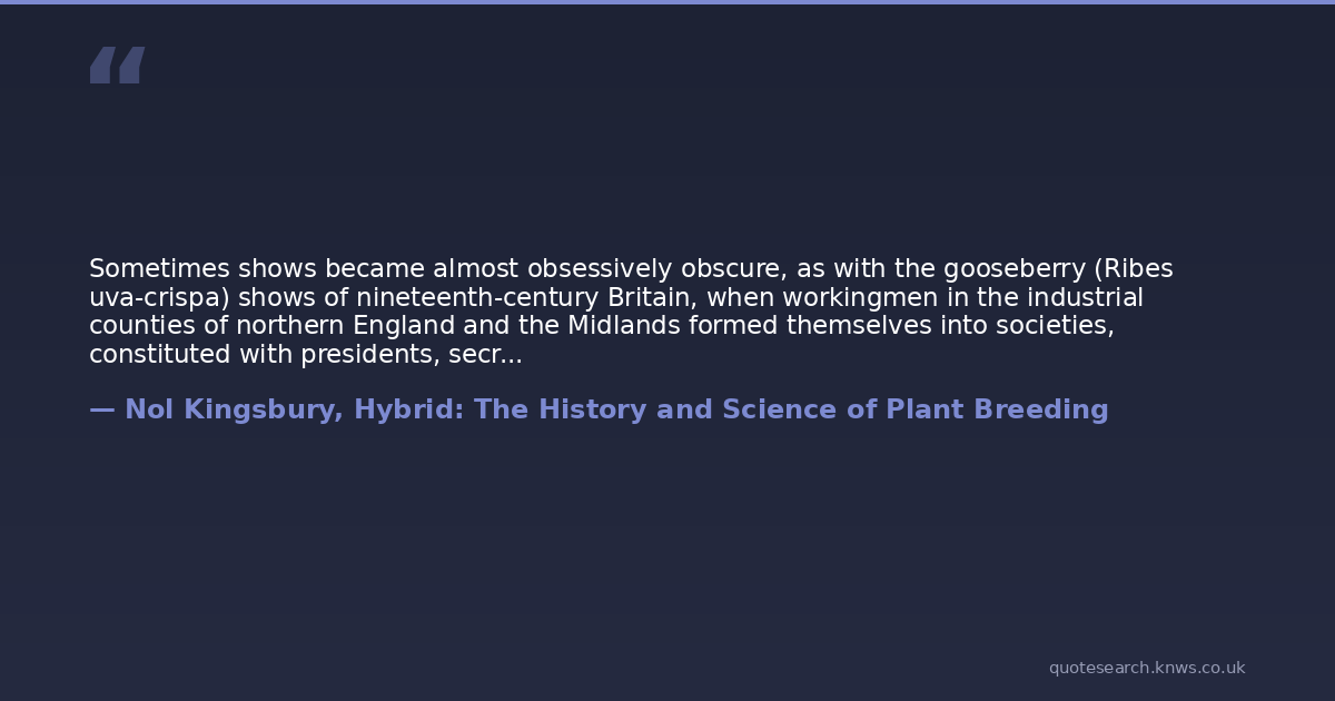 Sometimes shows became almost obsessively obscure, as with the gooseberry (Ribes uva-crispa) shows of nineteenth-century Britain, when workingmen in the industrial counties of northern England and the Midlands formed themselves into societies, constituted with presidents, secretaries, and stewards, for the purpose of running gooseberry showsweight being the decisive factor. Quite why this fruit, always something of a minority taste, should become the subject of what only could be described as a cult remains a mystery.