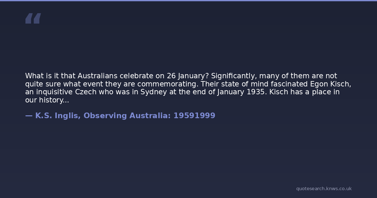 What is it that Australians celebrate on 26 January? Significantly, many of them are not quite sure what event they are commemorating. Their state of mind fascinated Egon Kisch, an inquisitive Czech who was in Sydney at the end of January 1935. Kisch has a place in our history as the victim, or hero, of a ludicrous chapter in the history of our immigration laws. He had been invited to Melbourne for a Congress against War and Fascism, and was forbidden to land by order of the attorney-general, R. G. Menzies. He had jumped overboard, broken his leg, gone to hospital, failed a dictation test in Gaelic and been sentenced to imprisonment and deportation. When the High Court declared Gaelic not a language, Kisch was free to hobble on our soil...