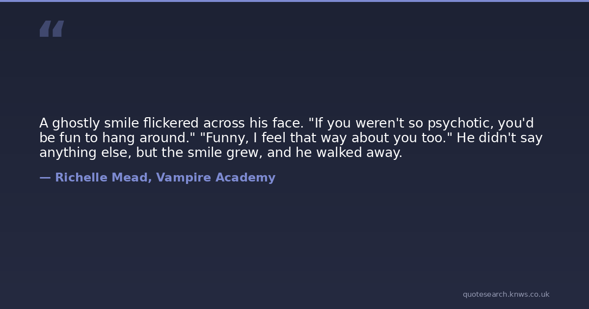 A ghostly smile flickered across his face. "If you weren't so psychotic, you'd be fun to hang around." "Funny, I feel that way about you too." He didn't say anything else, but the smile grew, and he walked away.