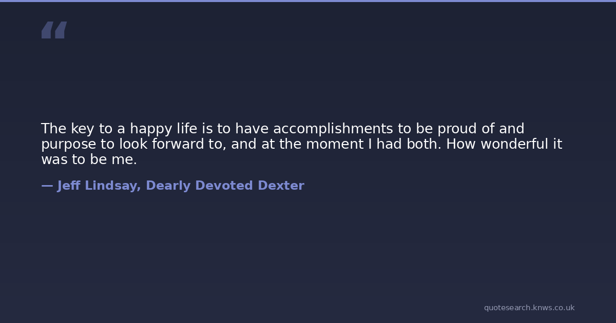 The key to a happy life is to have accomplishments to be proud of and purpose to look forward to, and at the moment I had both. How wonderful it was to be me.