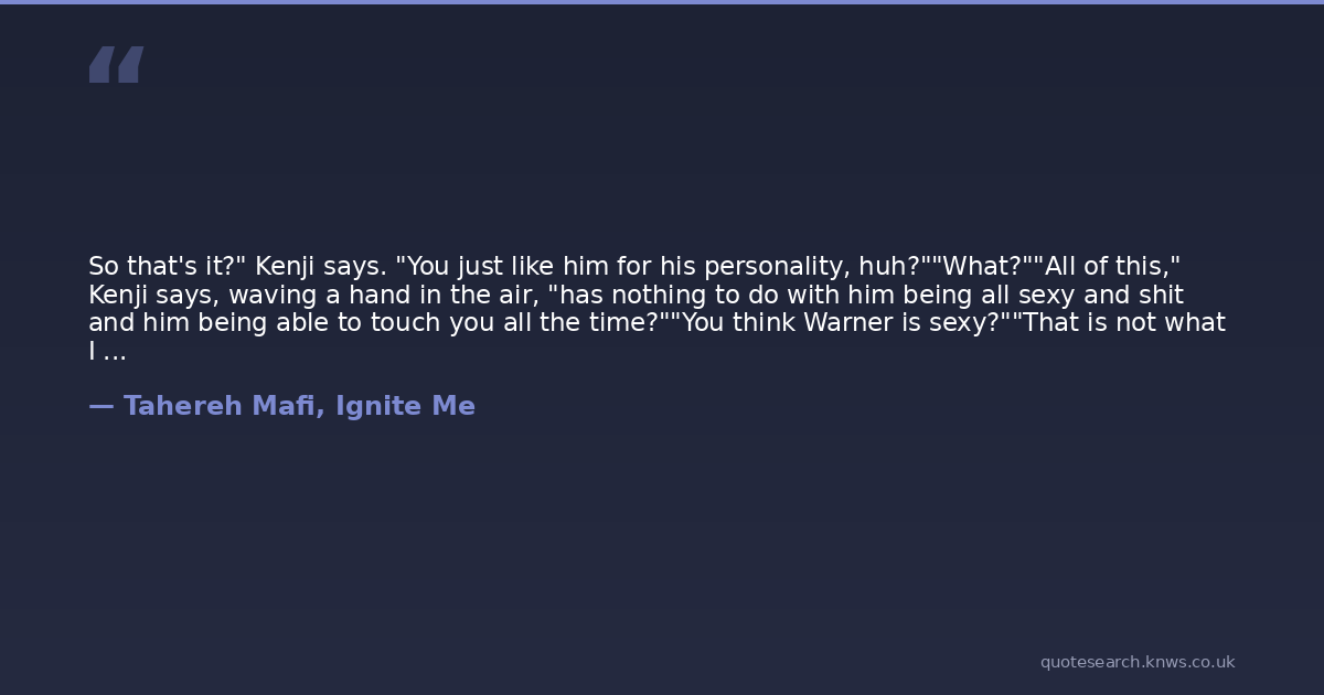 So that's it?" Kenji says. "You just like him for his personality, huh?""What?""All of this," Kenji says, waving a hand in the air, "has nothing to do with him being all sexy and shit and him being able to touch you all the time?""You think Warner is sexy?""That is not what I said.