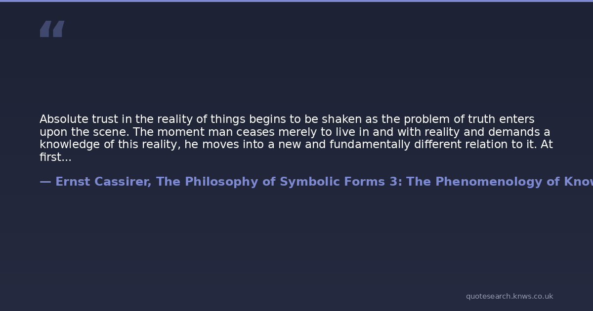 Absolute trust in the reality of things begins to be shaken as the problem of truth enters upon the scene. The moment man ceases merely to live in and with reality and demands a knowledge of this reality, he moves into a new and fundamentally different relation to it. At first, to be sure, the question of truth seems to apply only to particular parts and not to the whole of reality. Within this whole different strata of validity begin to be marked off, reality seems to separate sharply from appearance. But it lies in the very nature of the problem of truth that once it arises it never comes to rest. The concept of truth conceals an immanent dialectic that drives it inexorably forward, forever extending its limits.