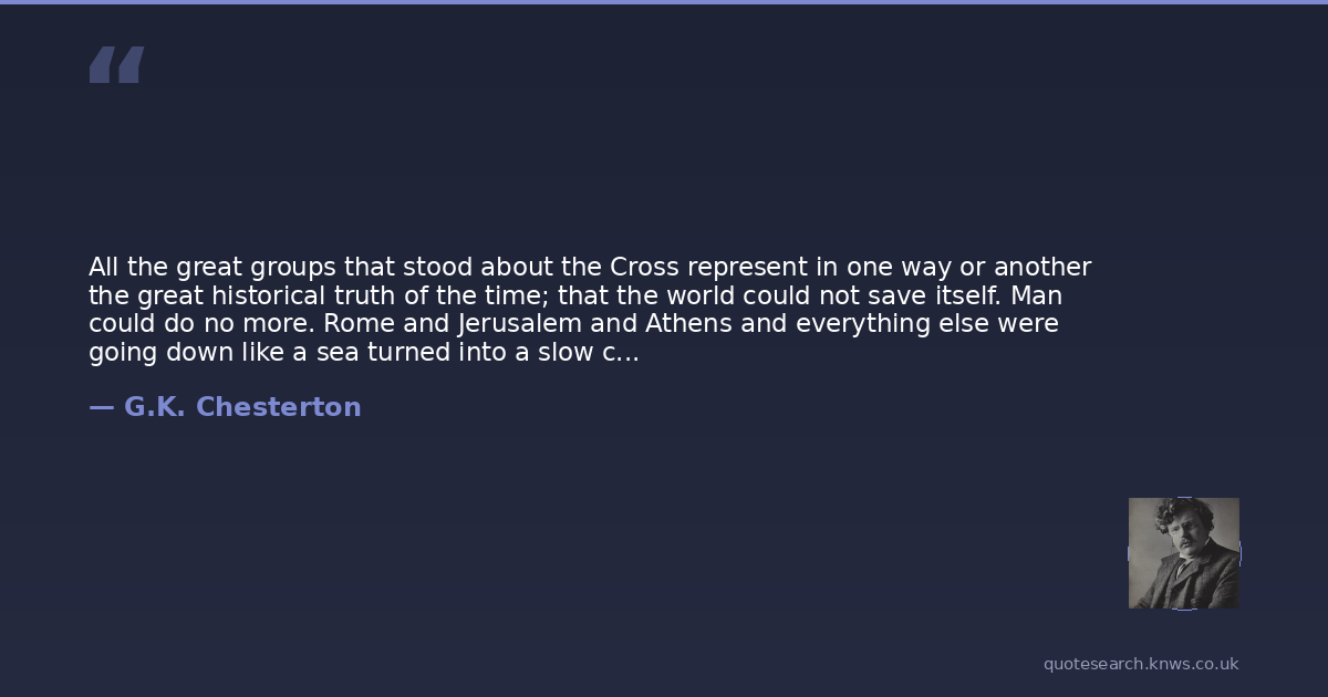 All the great groups that stood about the Cross represent in one way or another the great historical truth of the time; that the world could not save itself. Man could do no more. Rome and Jerusalem and Athens and everything else were going down like a sea turned into a slow cataract. Externally indeed the ancient world was still at its strongest; it is always at that moment that the inmost weakness begins. But in order to understand that weakness we must repeat what has been said more than once; that it was not the weakness of a thing originally weak. It was emphatically the strength of the world that was turned to weakness and the wisdom of the world that was turned to folly.In this story of Good Friday it is the best things in the world that are at their worst. That is what really shows us the world at its worst. It was, for instance, the priests of a true monotheism and the soldiers of an international civilisation. Rome, the legend, founded upon fallen Troy and triumphant over fallen Carthage, had stood for a heroism which was the nearest that any pagan ever came to chivalry. Rome had defended the household gods and the human decencies against the ogres of Africa and the hermaphrodite monstrosities of Greece. But in the lightning flash of this incident, we see great Rome, the imperial republic, going downward under her Lucretian doom. Scepticism has eaten away even the confident sanity of the conquerors of the world. He who is enthroned to say what is justice can only ask:What is truth? So in that drama which decided the whole fate of antiquity, one of the central figures is fixed in what seems the reverse of his true role. Rome was almost another name for responsibility. Yet he stands for ever as a sort of rocking statue of the irresponsible. Man could do no more. Even the practical had become the impracticable. Standing between the pillars of his own judgement-seat, a Roman had washed his hands of the world.