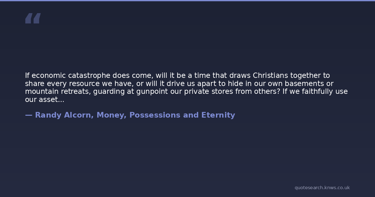 If economic catastrophe does come, will it be a time that draws Christians together to share every resource we have, or will it drive us apart to hide in our own basements or mountain retreats, guarding at gunpoint our private stores from others? If we faithfully use our assets for his kingdom now, rather than hoarding them, can't we trust our faithful God to provide for us then?