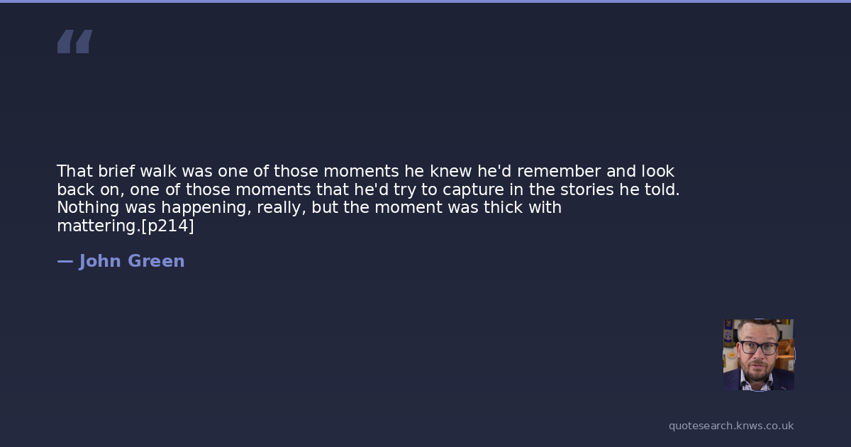 That brief walk was one of those moments he knew he'd remember and look back on, one of those moments that he'd try to capture in the stories he told. Nothing was happening, really, but the moment was thick with mattering.[p214]