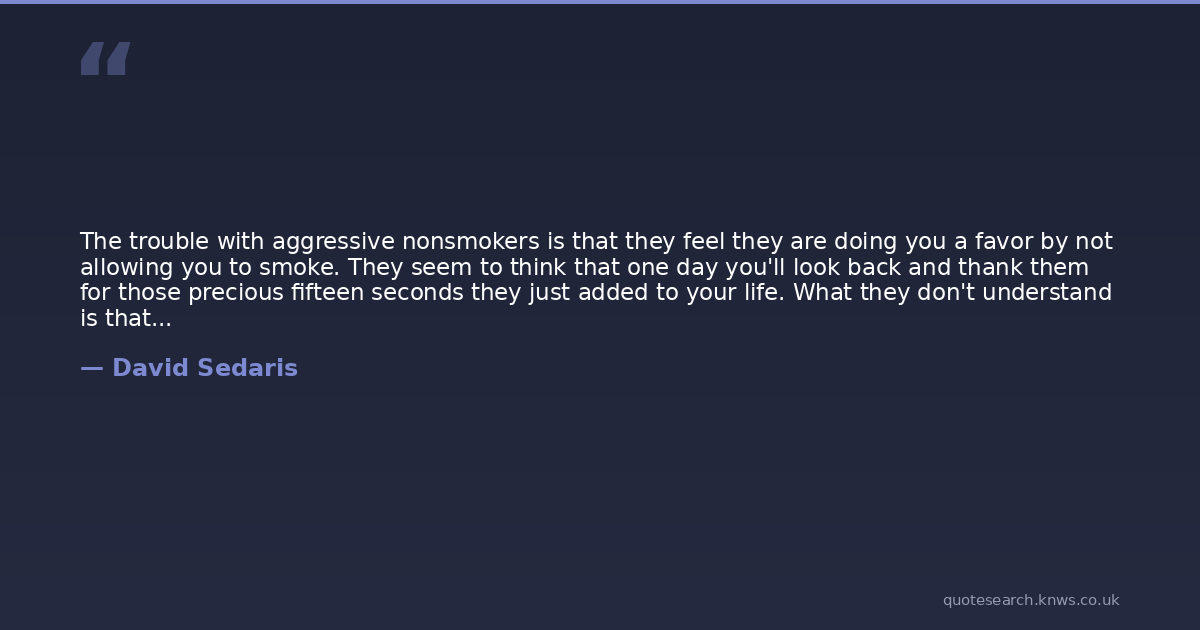 The trouble with aggressive nonsmokers is that they feel they are doing you a favor by not allowing you to smoke. They seem to think that one day you'll look back and thank them for those precious fifteen seconds they just added to your life. What they don't understand is that those are just fifteen more seconds you can spend hating their guts and plotting revenge.