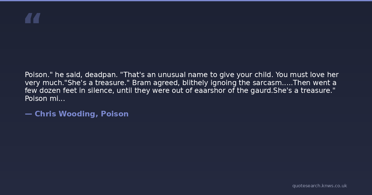 Poison." he said, deadpan. "That's an unusual name to give your child. You must love her very much."She's a treasure." Bram agreed, blithely ignoing the sarcasm.....Then went a few dozen feet in silence, until they were out of eaarshor of the gaurd.She's a treasure." Poison mimicked, and Bram burst out laughing.