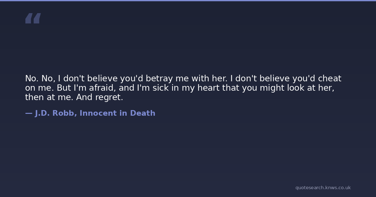 No. No, I don't believe you'd betray me with her. I don't believe you'd cheat on me. But I'm afraid, and I'm sick in my heart that you might look at her, then at me. And regret.