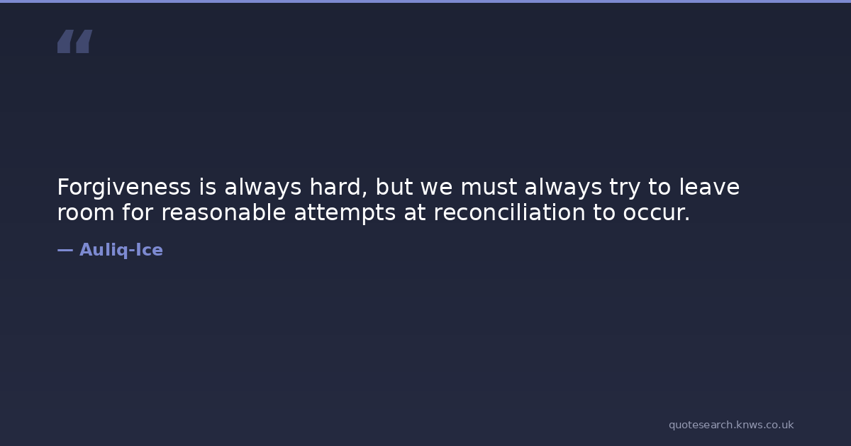 Forgiveness is always hard, but we must always try to leave room for reasonable attempts at reconciliation to occur. benignity forgiveness humanity kindness love mercifulness peace reconciliation Download Image Share on X Share on Facebook Copy Link