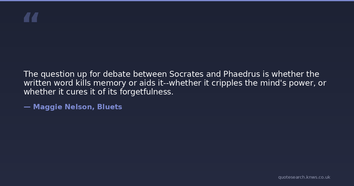 The question up for debate between Socrates and Phaedrus is whether the written word kills memory or aids it--whether it cripples the mind's power, or whether it cures it of its forgetfulness.