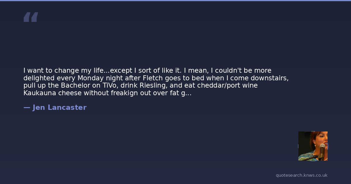 I want to change my life...except I sort of like it. I mean, I couldn't be more delighted every Monday night after Fletch goes to bed when I come downstairs, pull up the Bachelor on TiVo, drink Riesling, and eat cheddar/port wine Kaukauna cheese without freakign out over fat grams. I'm perpetually in a good mood because I do everything I want. I love having the freedom to skip the gym to watch a Don Knots movie on the Disney Channel without a twinge of guilt. I've figured out how to not be beholden to what other people believe I should be doing, and when the world tells me I ought to be a size eight, I can thumb my nose at them in complete empowerment.