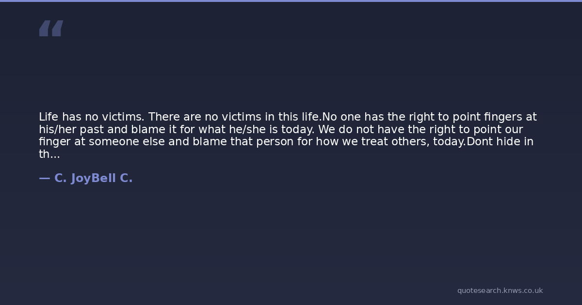 Life has no victims. There are no victims in this life.No one has the right to point fingers at his/her past and blame it for what he/she is today. We do not have the right to point our finger at someone else and blame that person for how we treat others, today.Dont hide in the corner, pointing fingers at your past. Dont sit under the table, talking about someone who has hurt you. Instead, stand up and face your past! Face your fears! Face your pain! And stomach it all! You may have to do so kicking and screaming and throwing fits and crying- but by all means- face it!This life makes no room for cowards.