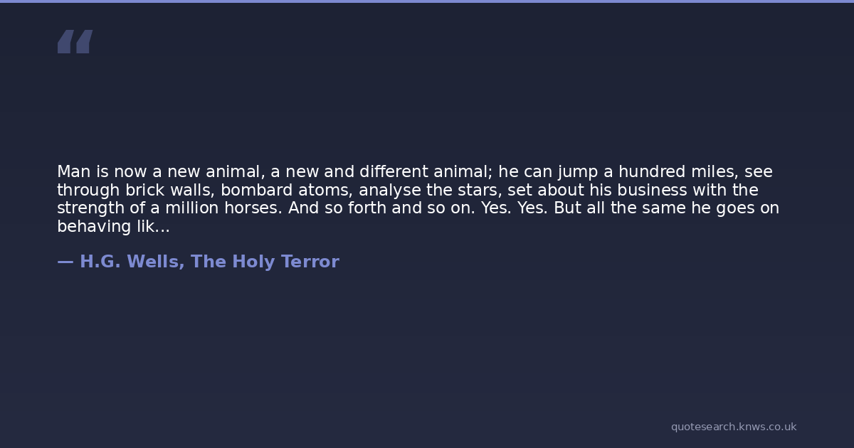 Man is now a new animal, a new and different animal; he can jump a hundred miles, see through brick walls, bombard atoms, analyse the stars, set about his business with the strength of a million horses. And so forth and so on. Yes. Yes. But all the same he goes on behaving like the weak little needy ape he used to be. He grabs, snarls, quarrels, fears, stampedes, and plays in his immense powder magazine until he seems likely to blow up the whole damned show.