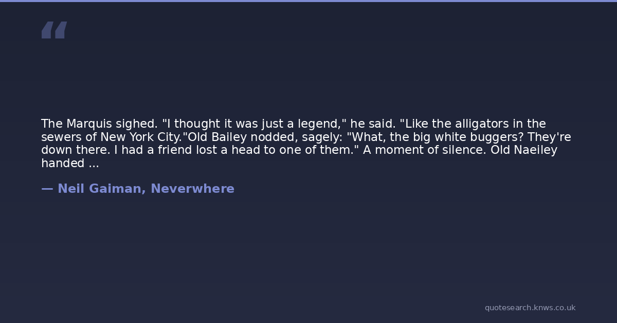 The Marquis sighed. "I thought it was just a legend," he said. "Like the alligators in the sewers of New York City."Old Bailey nodded, sagely: "What, the big white buggers? They're down there. I had a friend lost a head to one of them." A moment of silence. Old Naeiley handed the statue back to the Marquis. Then he raised his hand, and snapped it, like a crocodile hand, at the Carabas. "It was OK," gurned Old Bailey with a grin that was most terrible to behold. "He had another.