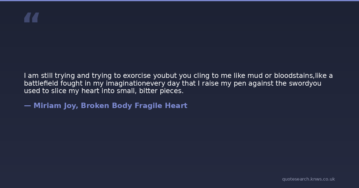 I am still trying and trying to exorcise youbut you cling to me like mud or bloodstains,like a battlefield fought in my imaginationevery day that I raise my pen against the swordyou used to slice my heart into small, bitter pieces.