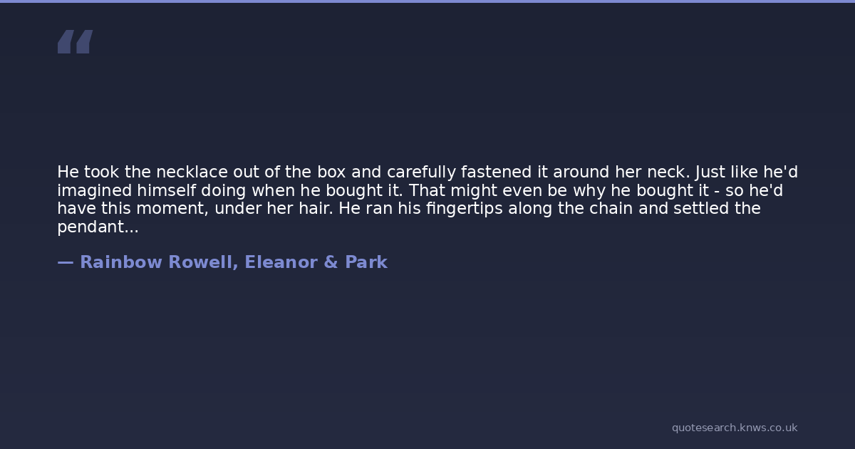 He took the necklace out of the box and carefully fastened it around her neck. Just like he'd imagined himself doing when he bought it. That might even be why he bought it - so he'd have this moment, under her hair. He ran his fingertips along the chain and settled the pendant on her throat.