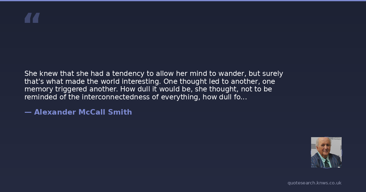 She knew that she had a tendency to allow her mind to wander, but surely that's what made the world interesting. One thought led to another, one memory triggered another. How dull it would be, she thought, not to be reminded of the interconnectedness of everything, how dull for the present not to evoke the past, for here not to imply there.