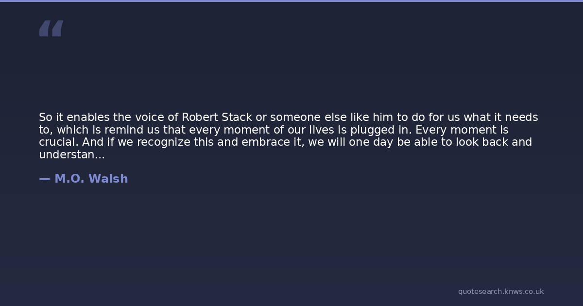 So it enables the voice of Robert Stack or someone else like him to do for us what it needs to, which is remind us that every moment of our lives is plugged in. Every moment is crucial. And if we recognize this and embrace it, we will one day be able to look back and understand and feel and regret and reminisce and, if we are lucky, cherish.
