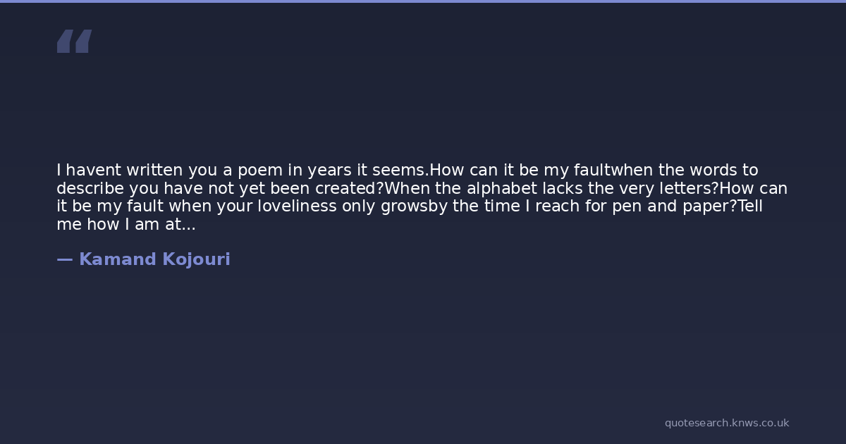 I havent written you a poem in years it seems.How can it be my faultwhen the words to describe you have not yet been created?When the alphabet lacks the very letters?How can it be my fault when your loveliness only growsby the time I reach for pen and paper?Tell me how I am at faultwhen I am only a beginner in poemsand you are exquisite poetry?To write you in words is to put a veil upon you.Why must I writewhen I can kiss you instead?