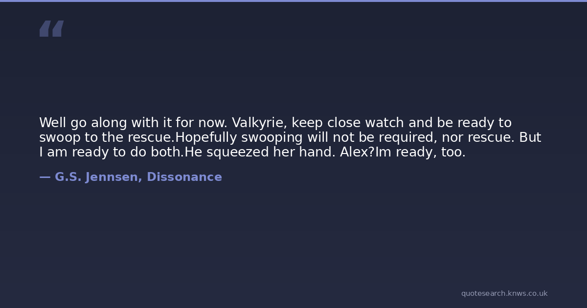 Well go along with it for now. Valkyrie, keep close watch and be ready to swoop to the rescue.Hopefully swooping will not be required, nor rescue. But I am ready to do both.He squeezed her hand. Alex?Im ready, too.