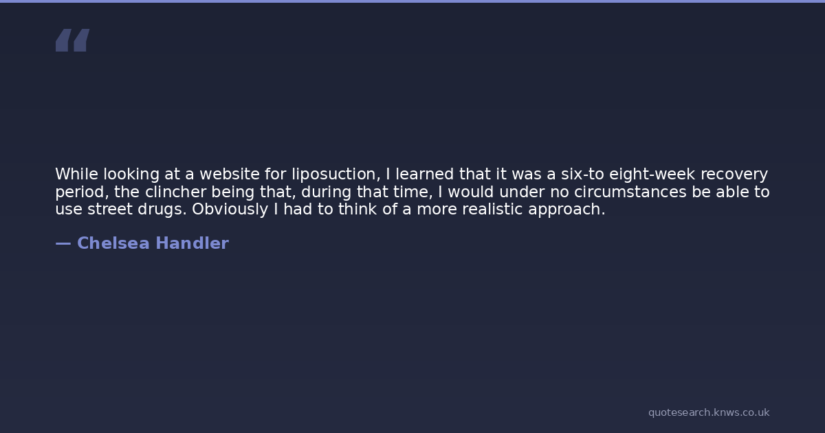 While looking at a website for liposuction, I learned that it was a six-to eight-week recovery period, the clincher being that, during that time, I would under no circumstances be able to use street drugs. Obviously I had to think of a more realistic approach.