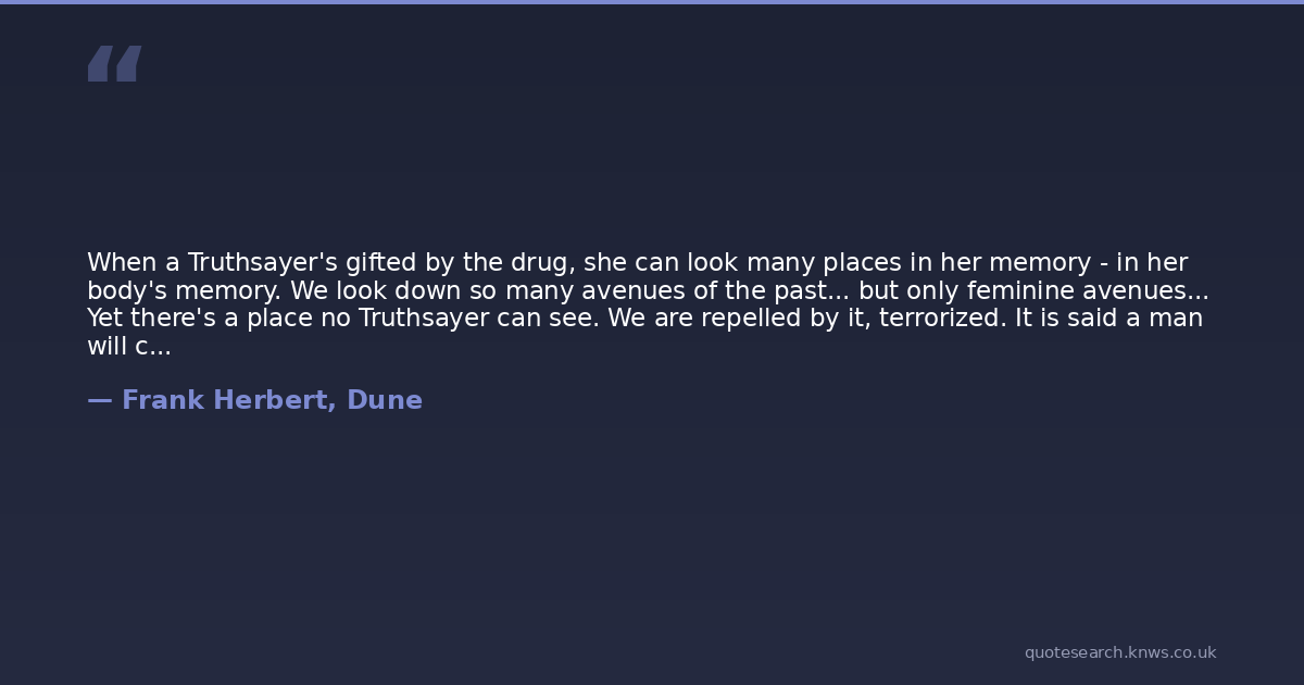 When a Truthsayer's gifted by the drug, she can look many places in her memory - in her body's memory. We look down so many avenues of the past... but only feminine avenues... Yet there's a place no Truthsayer can see. We are repelled by it, terrorized. It is said a man will come one day and find in the gift of the drug his inward eye. He will look where we cannot - into both feminine and masculine pasts... Many men have tried the drug... so many, but none has succeeded.""They tried and failed, all of them?""They tried and died.