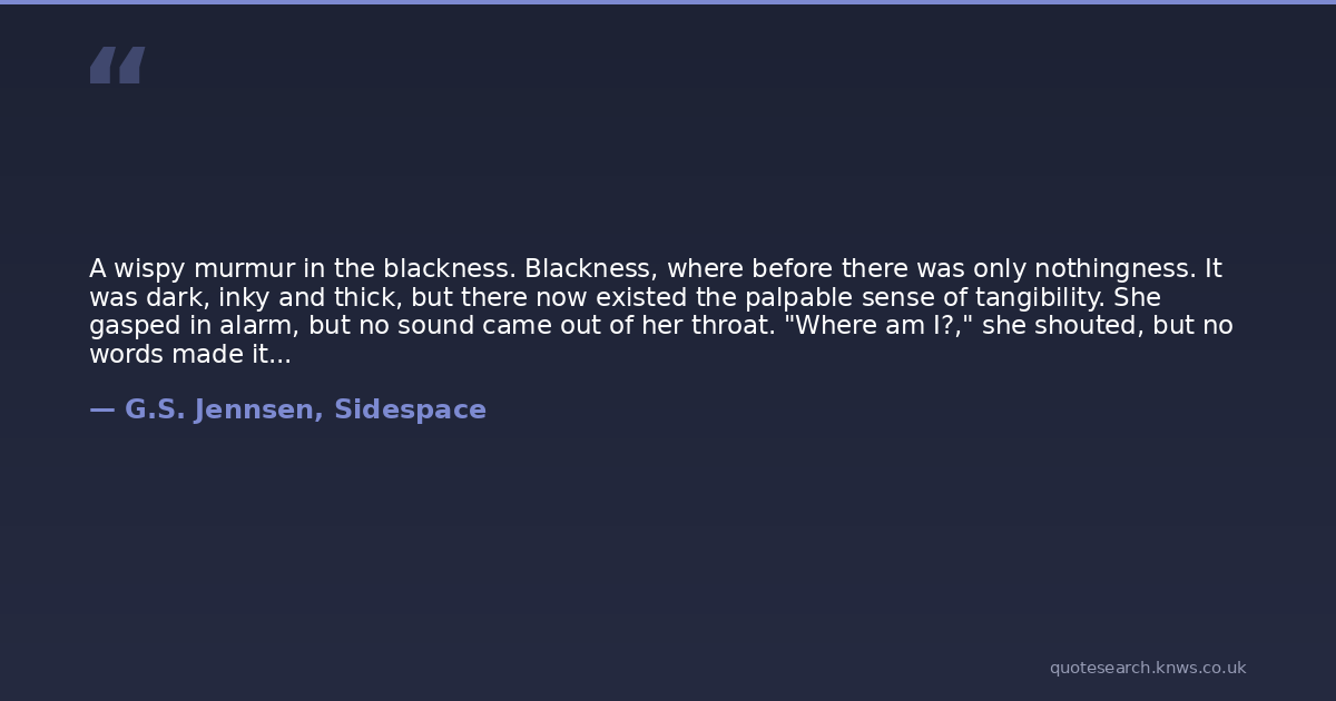 A wispy murmur in the blackness. Blackness, where before there was only nothingness. It was dark, inky and thick, but there now existed the palpable sense of tangibility. She gasped in alarm, but no sound came out of her throat. "Where am I?," she shouted, but no words made it past her lips.