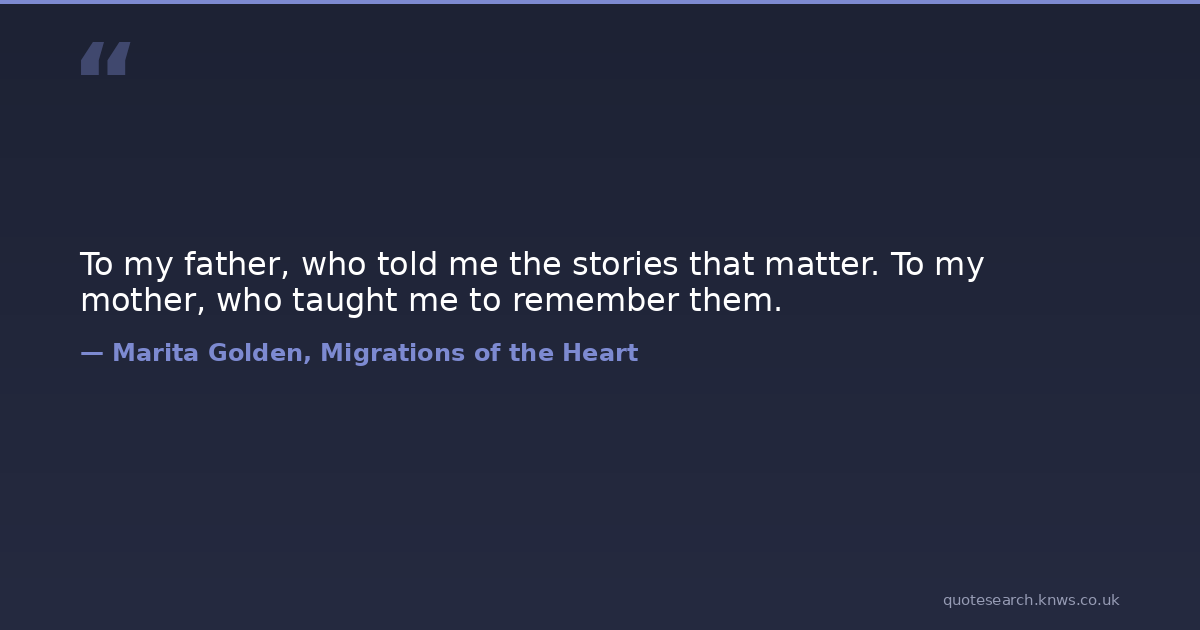 To my father, who told me the stories that matter. To my mother, who taught me to remember them. dedications father memory mother parents remember stories Download Image Share on X Share on Facebook Copy Link