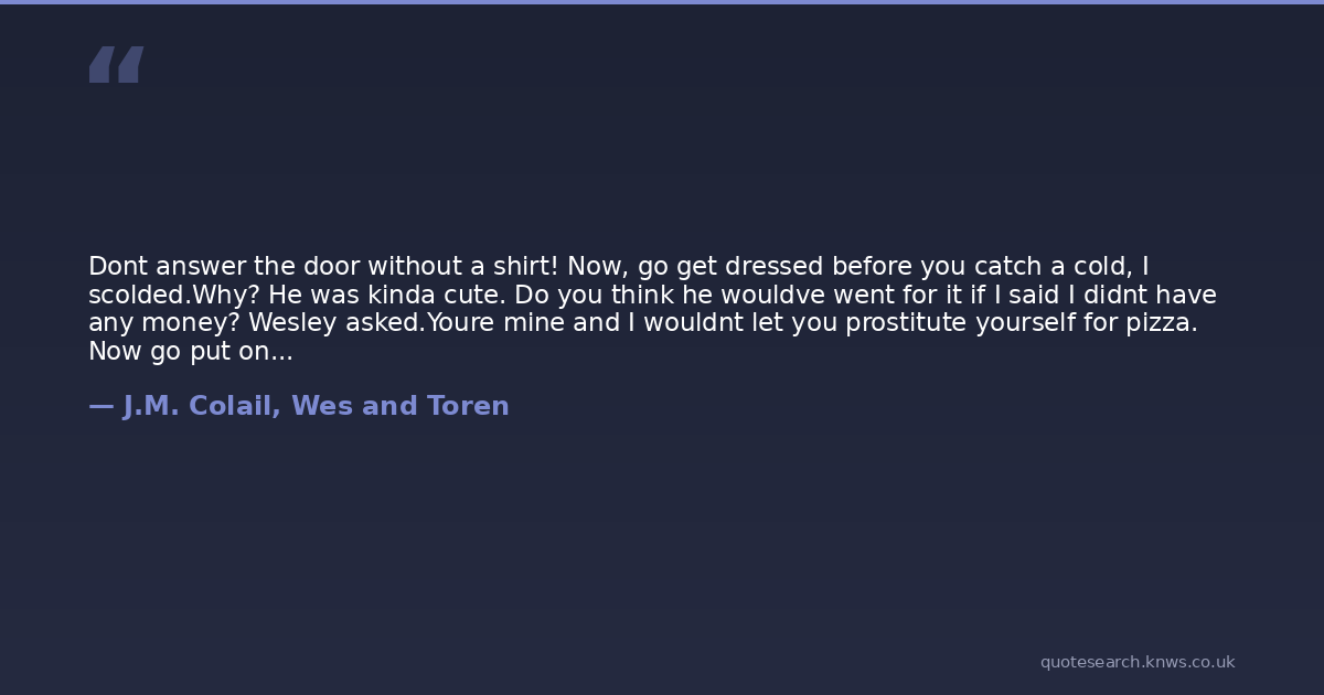 Dont answer the door without a shirt! Now, go get dressed before you catch a cold, I scolded.Why? He was kinda cute. Do you think he wouldve went for it if I said I didnt have any money? Wesley asked.Youre mine and I wouldnt let you prostitute yourself for pizza. Now go put on a shirt, I said, pulling two slices onto a plate.