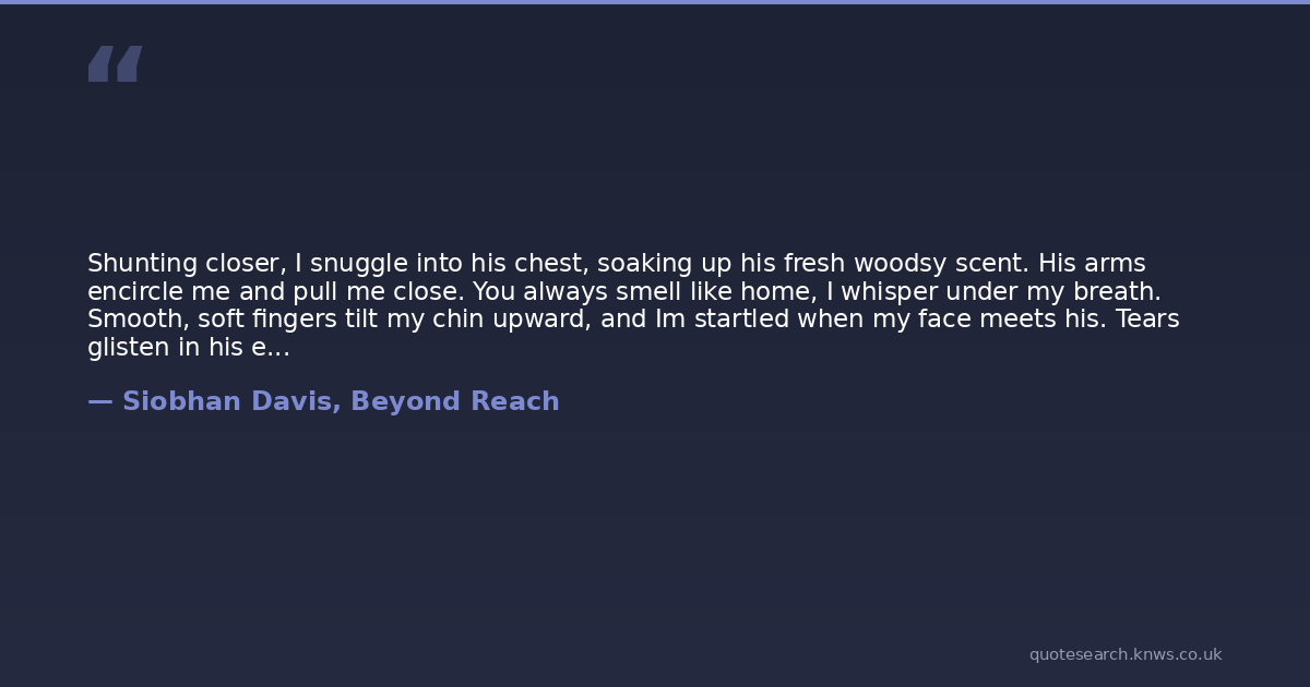 Shunting closer, I snuggle into his chest, soaking up his fresh woodsy scent. His arms encircle me and pull me close. You always smell like home, I whisper under my breath. Smooth, soft fingers tilt my chin upward, and Im startled when my face meets his. Tears glisten in his eyes as he looks at me adoringly. Pressing his forehead to mine, he kisses me sweetly, his lips making brisk tantalizing sweeps across my mouth.My heart is your home, he whispers, his voice breathless. It always will be.