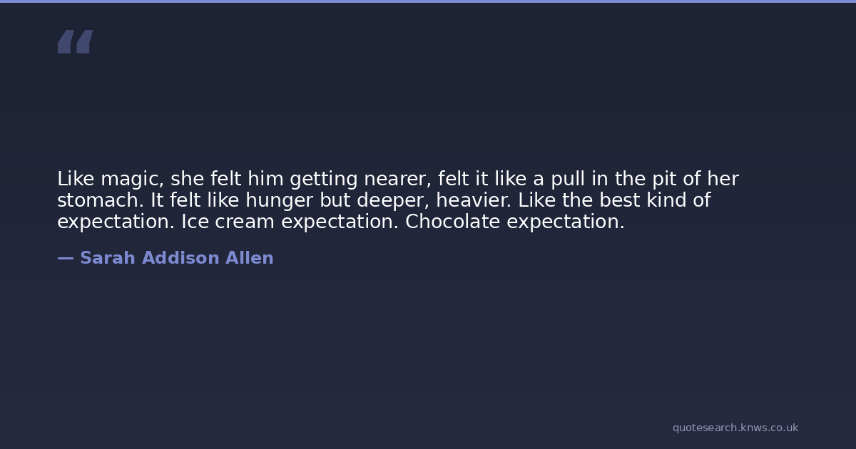 Like magic, she felt him getting nearer, felt it like a pull in the pit of her stomach. It felt like hunger but deeper, heavier. Like the best kind of expectation. Ice cream expectation. Chocolate expectation.