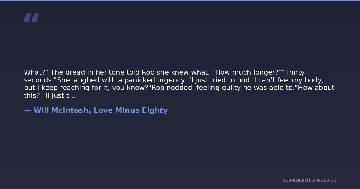 What?" The dread in her tone told Rob she knew what. "How much longer?""Thirty seconds."She laughed with a panicked urgency. "I just tried to nod. I can't feel my body, but I keep reaching for it, you know?"Rob nodded, feeling guilty he was able to."How about this? I'll just tell you when I'm nodding, or shaking my head, or punching you.""Oh, no," Rob laughed, "are you planning on punching me often?""We'll see."Rob couldn't help glancing at the timer, though he knew it would only make Winter more aware of what was about to happen. Seven seconds."I keep expecting this to get easier, taht it will start to feel as if I'm going to sleep. But it doesn't. Maybe it's not possible to get used to dying."Rob reached out to comfort her, then remembered it was forbidden and drew back. If not for the surveillance, Rob would have reached under the silver cover and taken her hand, cold and stiff as it would have been.