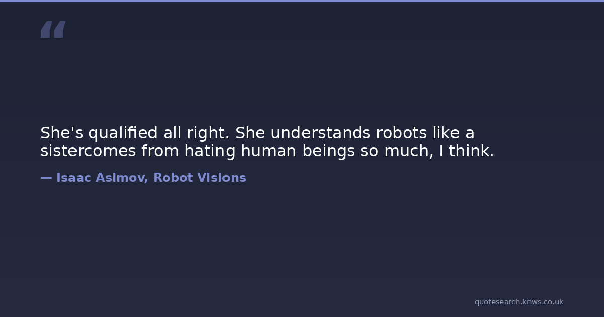 She's qualified all right. She understands robots like a sistercomes from hating human beings so much, I think. robots science-fiction Download Image Share on X Share on Facebook Copy Link