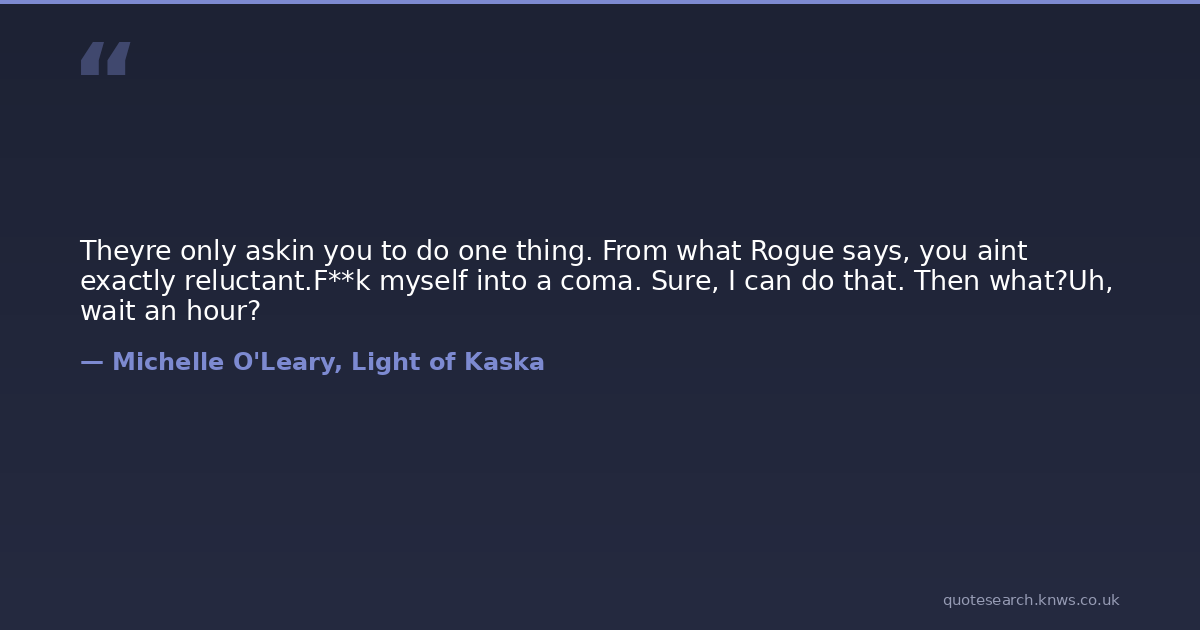 Theyre only askin you to do one thing. From what Rogue says, you aint exactly reluctant.F**k myself into a coma. Sure, I can do that. Then what?Uh, wait an hour?
