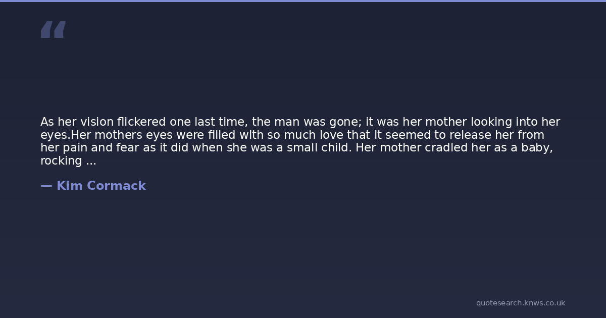 As her vision flickered one last time, the man was gone; it was her mother looking into her eyes.Her mothers eyes were filled with so much love that it seemed to release her from her pain and fear as it did when she was a small child. Her mother cradled her as a baby, rocking her back and forth. She was safe now in her mothers arms. She was at peace. Mommy, her heart sang, youre here to save me.
