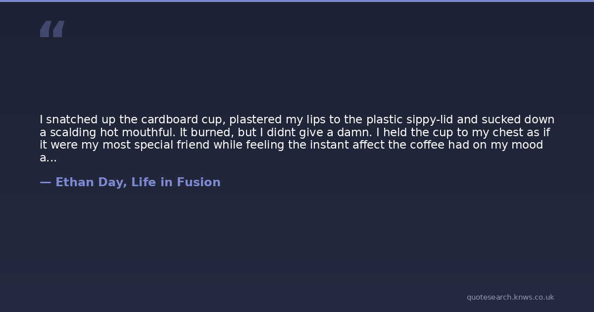 I snatched up the cardboard cup, plastered my lips to the plastic sippy-lid and sucked down a scalding hot mouthful. It burned, but I didnt give a damn. I held the cup to my chest as if it were my most special friend while feeling the instant affect the coffee had on my mood and I smiled. Hello lover.