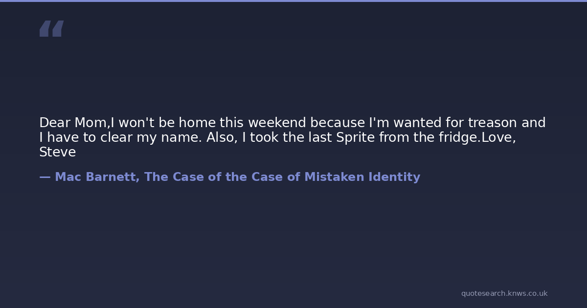 Dear Mom,I won't be home this weekend because I'm wanted for treason and I have to clear my name. Also, I took the last Sprite from the fridge.Love, Steve