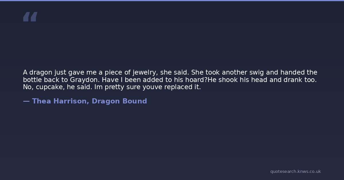 A dragon just gave me a piece of jewelry, she said. She took another swig and handed the bottle back to Graydon. Have I been added to his hoard?He shook his head and drank too. No, cupcake, he said. Im pretty sure youve replaced it.