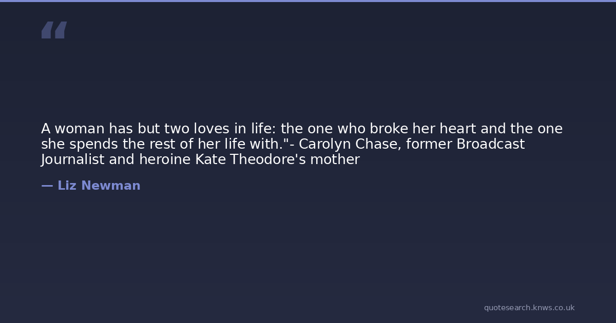 A woman has but two loves in life: the one who broke her heart and the one she spends the rest of her life with."- Carolyn Chase, former Broadcast Journalist and heroine Kate Theodore's mother