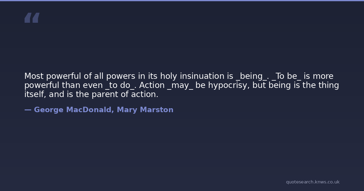 Most powerful of all powers in its holy insinuation is _being_. _To be_ is more powerful than even _to do_. Action _may_ be hypocrisy, but being is the thing itself, and is the parent of action.