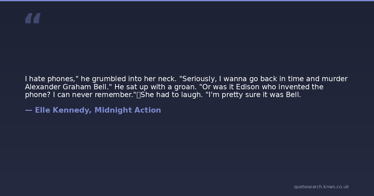 I hate phones," he grumbled into her neck. "Seriously, I wanna go back in time and murder Alexander Graham Bell." He sat up with a groan. "Or was it Edison who invented the phone? I can never remember." She had to laugh. "I'm pretty sure it was Bell.