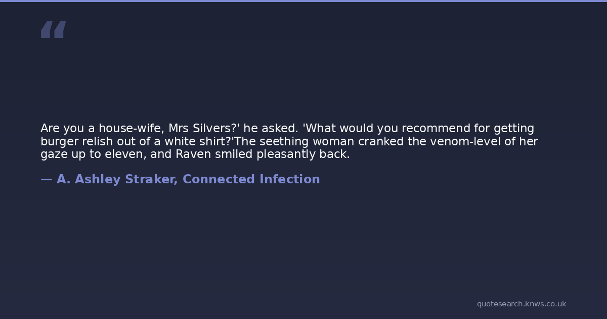 Are you a house-wife, Mrs Silvers?' he asked. 'What would you recommend for getting burger relish out of a white shirt?'The seething woman cranked the venom-level of her gaze up to eleven, and Raven smiled pleasantly back.