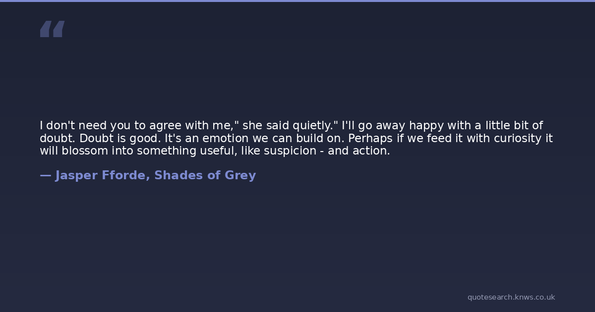 I don't need you to agree with me," she said quietly." I'll go away happy with a little bit of doubt. Doubt is good. It's an emotion we can build on. Perhaps if we feed it with curiosity it will blossom into something useful, like suspicion - and action.