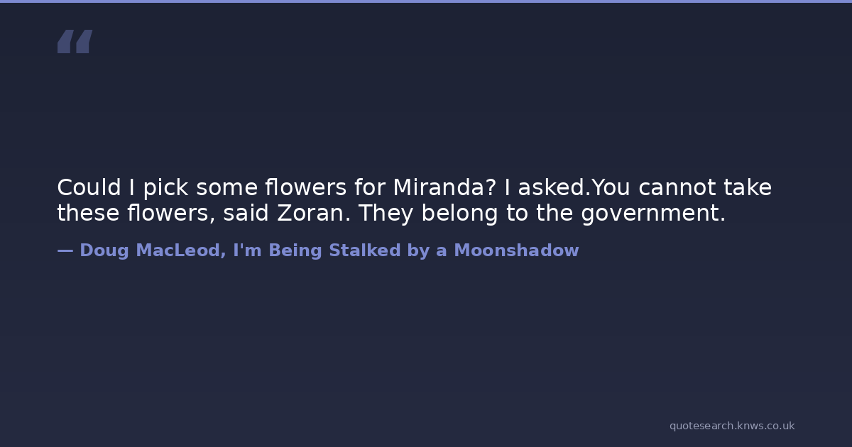 Could I pick some flowers for Miranda? I asked.You cannot take these flowers, said Zoran. They belong to the government. funny Download Image Share on X Share on Facebook Copy Link