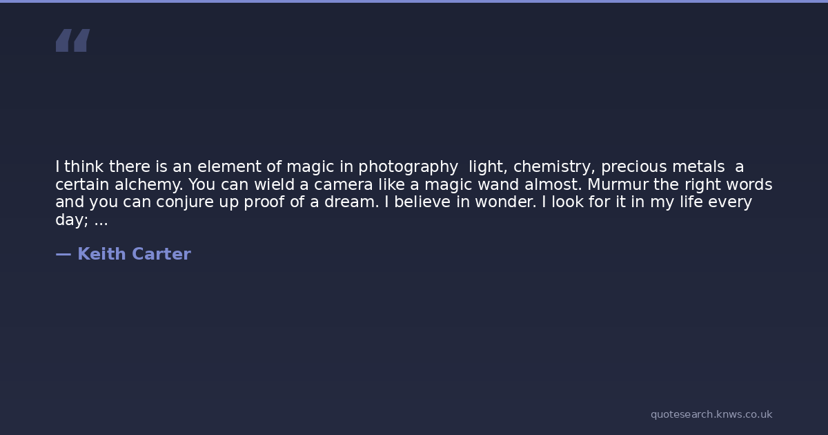 I think there is an element of magic in photography light, chemistry, precious metals a certain alchemy. You can wield a camera like a magic wand almost. Murmur the right words and you can conjure up proof of a dream. I believe in wonder. I look for it in my life every day; I find it in the most ordinary things.